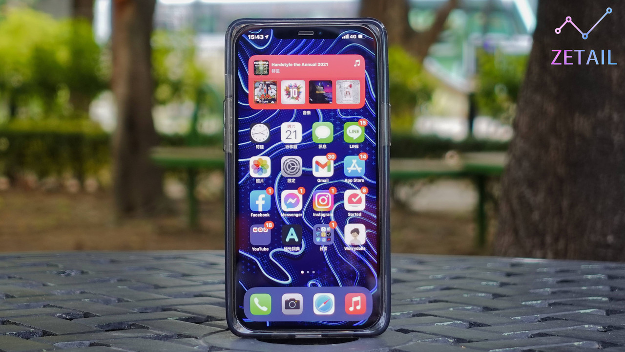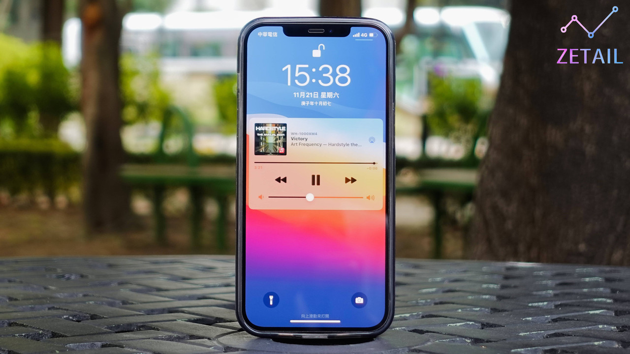 ▲ 裝上 Mouve 後的 iPhone 12 Pro Max 正面,因為保護殼的關係,整體感覺變得比較方正。