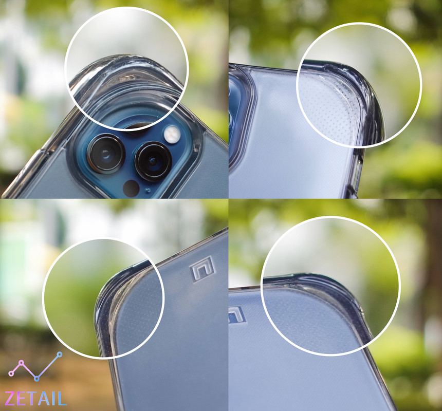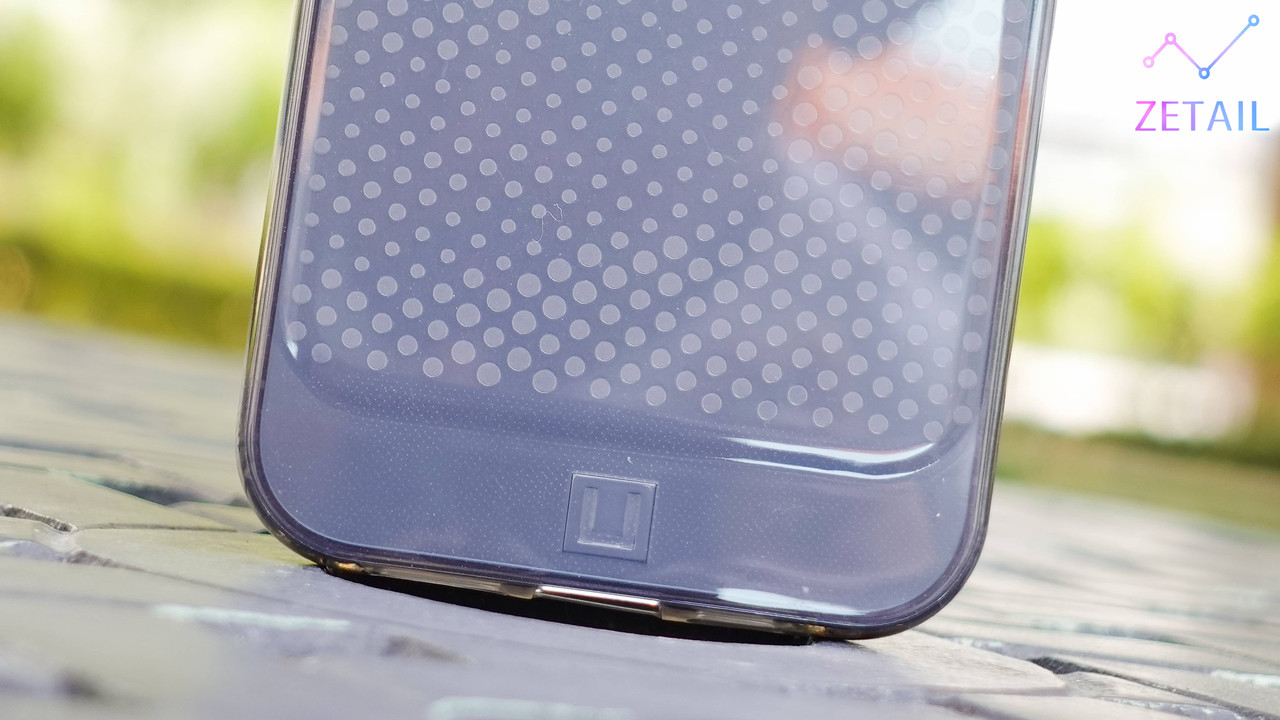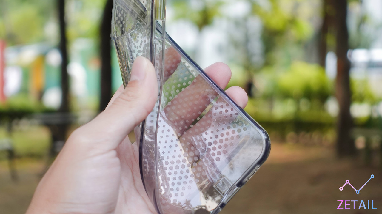 Lucent 保護殼的整體設計相對剛剛介紹的 Mouve 比較普通,從「亮透款」不難猜到它的設計偏向一般的透明保護殼,不過 UAG 還是在背板的內部加入了「點點」設計,「點點」可以說是貫穿整個 [U] 系列的重要元素,等等還會提到;但 Lucent 的點點尺寸比 Mouve 的大很多,而且也不在外側,所以它其實就是「純裝飾」,並沒有特殊用途。