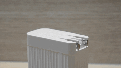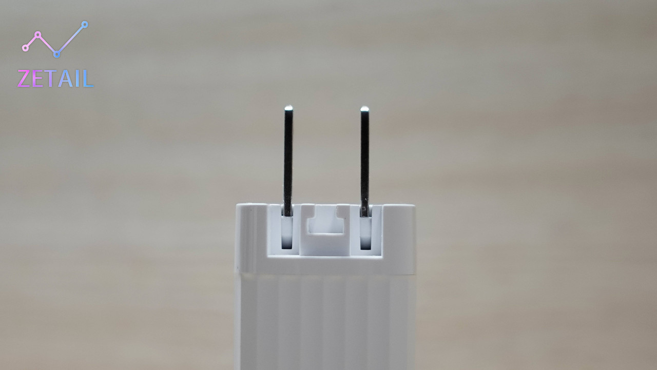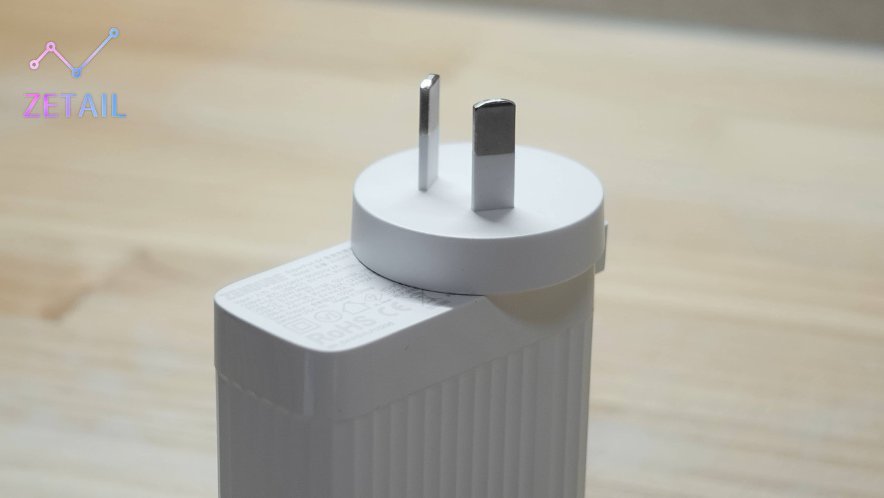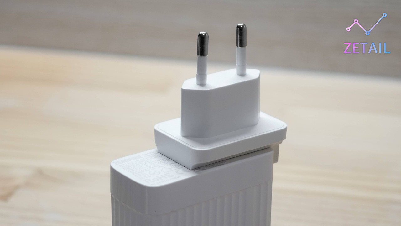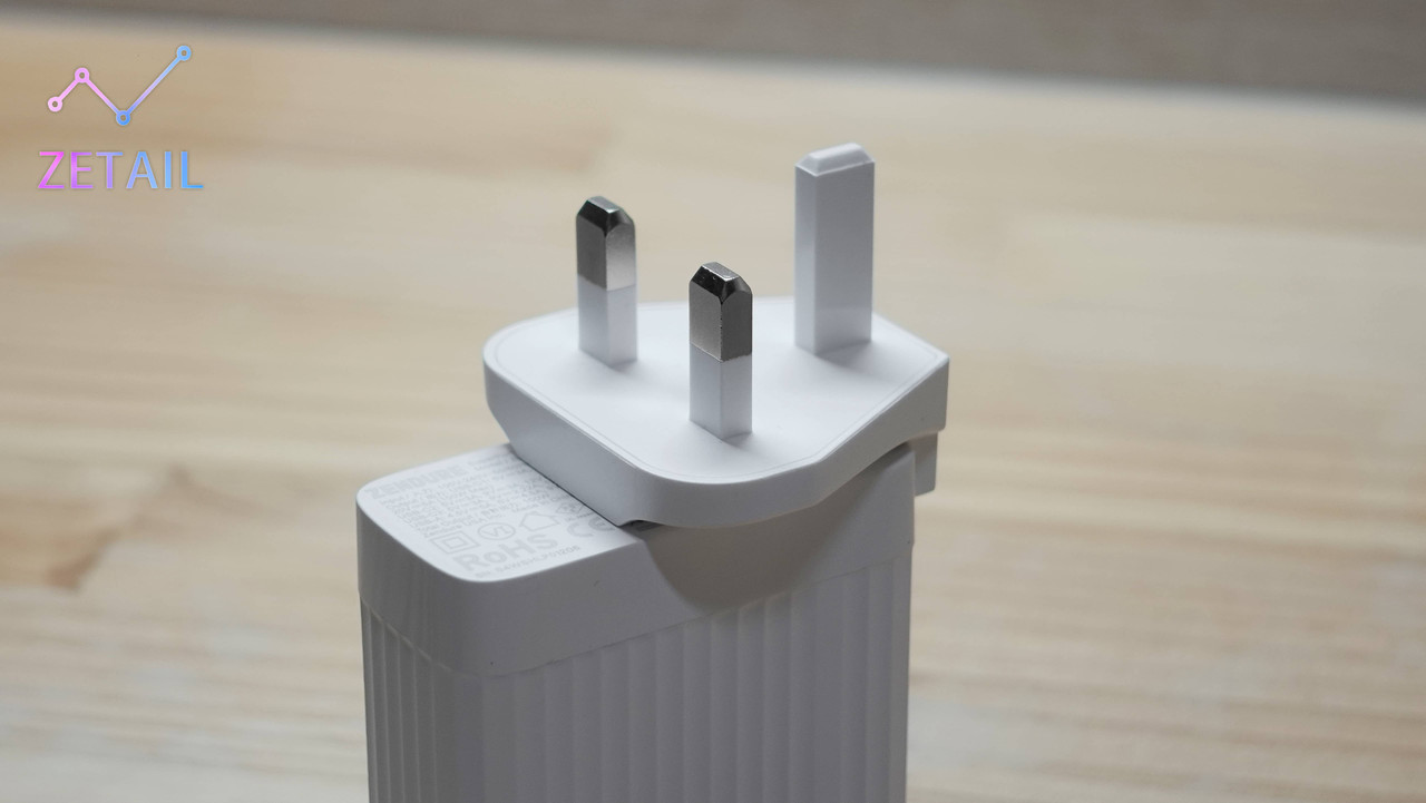 對於一個 100W 充電器來說,SuperPort S4 的體積真的非常小,這當然是得益於 GaN 氮化鎵材料的搭載,等等會再提到。SuperPort S4 的正面面積就如 Zendure 宣傳的,和一張信用卡、悠遊卡差不多,甚至比蘋果的 96W 充電器還小;厚度則與一般充電器大同小異。另外,SuperPort S4 也有「折疊插頭」的設計,所以外出旅行或不使用時,可以把插頭折起來,避免佔空間或刮傷其它物品。