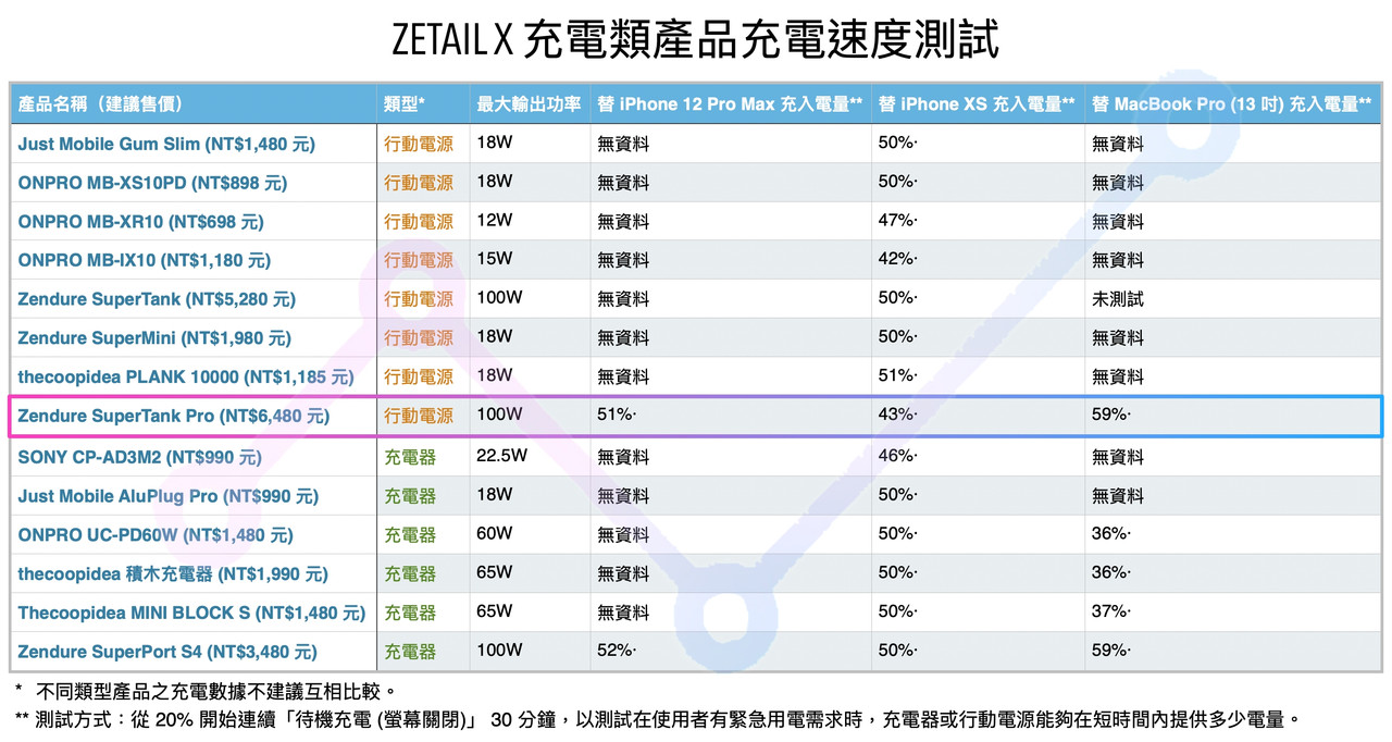 開箱充電產品少不了經過 ZETAIL 的標準測試環節,而且就像我剛剛說的,SuperTank Pro 出乎意料地有著更勝 SuperTank 的表現,先從「一般充電測試」(20% 開始,連續「待機充電」30 分鐘)來看,這是為了測試當使用者有緊急用電需求時,行動電源能夠在短時間內提供裝置多少電量。SuperTank Pro 替 iPhone 12 Pro Max 充到了 71%,表現符合蘋果宣稱的 PD 3.0 快充速度(30 分鐘充 50%)。