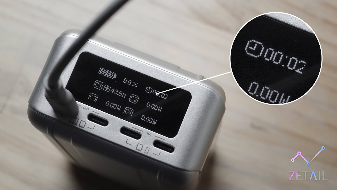 Zendure SuperTank Pro 的一大亮點就是它用一片碩大的「OLED 螢幕」換掉了 SuperTank 單純用來顯示剩餘電量、充電模式的 LED 螢幕,現在可以顯示的內容更多、更詳盡了,除了最基本的剩餘電量外,還可以看到每一個插槽獨立的充電狀態、SuperTank Pro 本身的充電剩餘時間…等,讓使用者更能清楚掌握充電資訊。