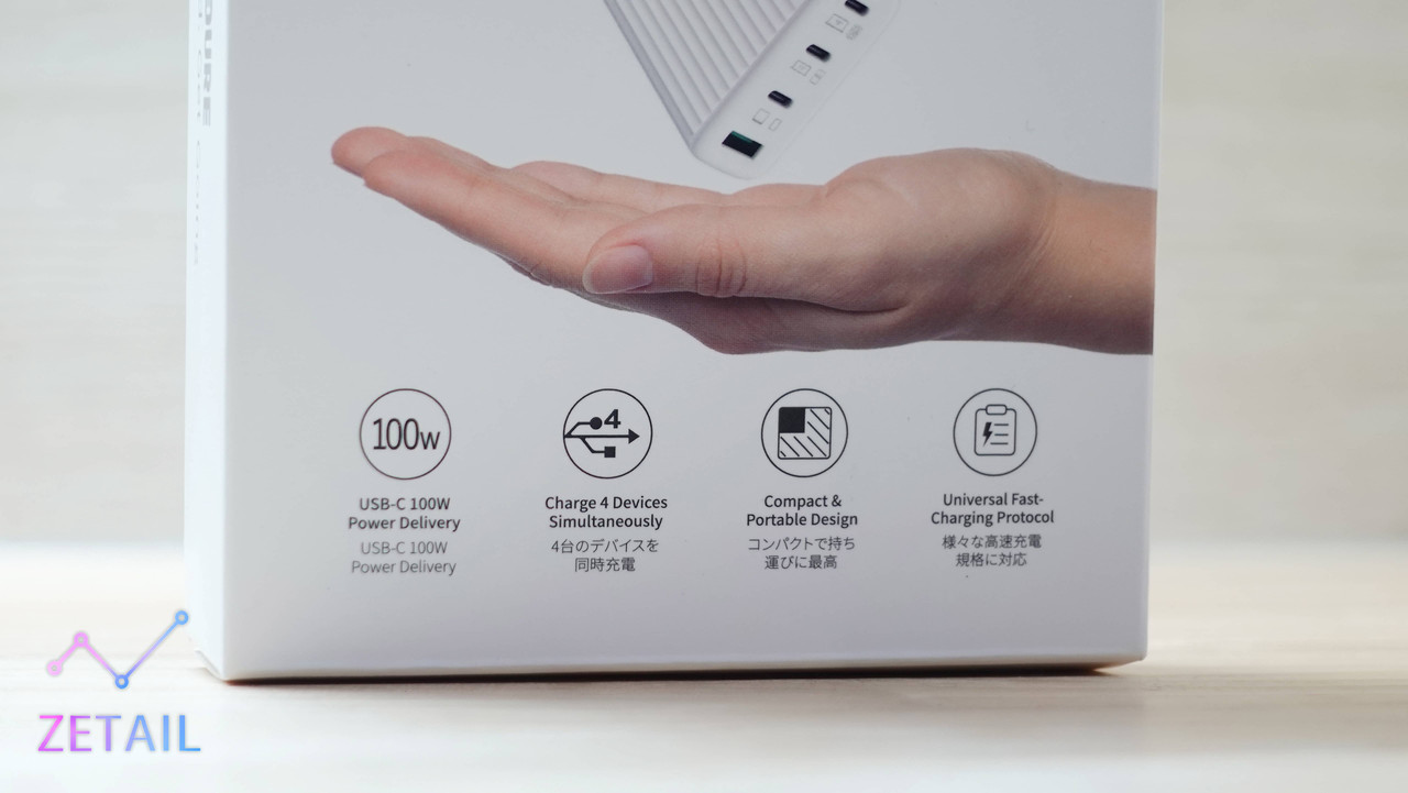 ▲ Zendure 在下方整理出了四個 SuperPort S4 的特色,分別是「100W 輸出 PD 快充」、「同時替四台裝置充電」、「輕便的設計」、「支援各種快充協議」。