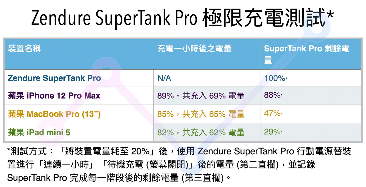 ▲ 在「極限充電測試」中, 我會拿 SuperTank Pro 依序分別幫 iPhone 12 Pro Max、MacBook Pro 和 iPad mini 5 連續充電一小時,看看 SuperTank Pro 到底有多強?