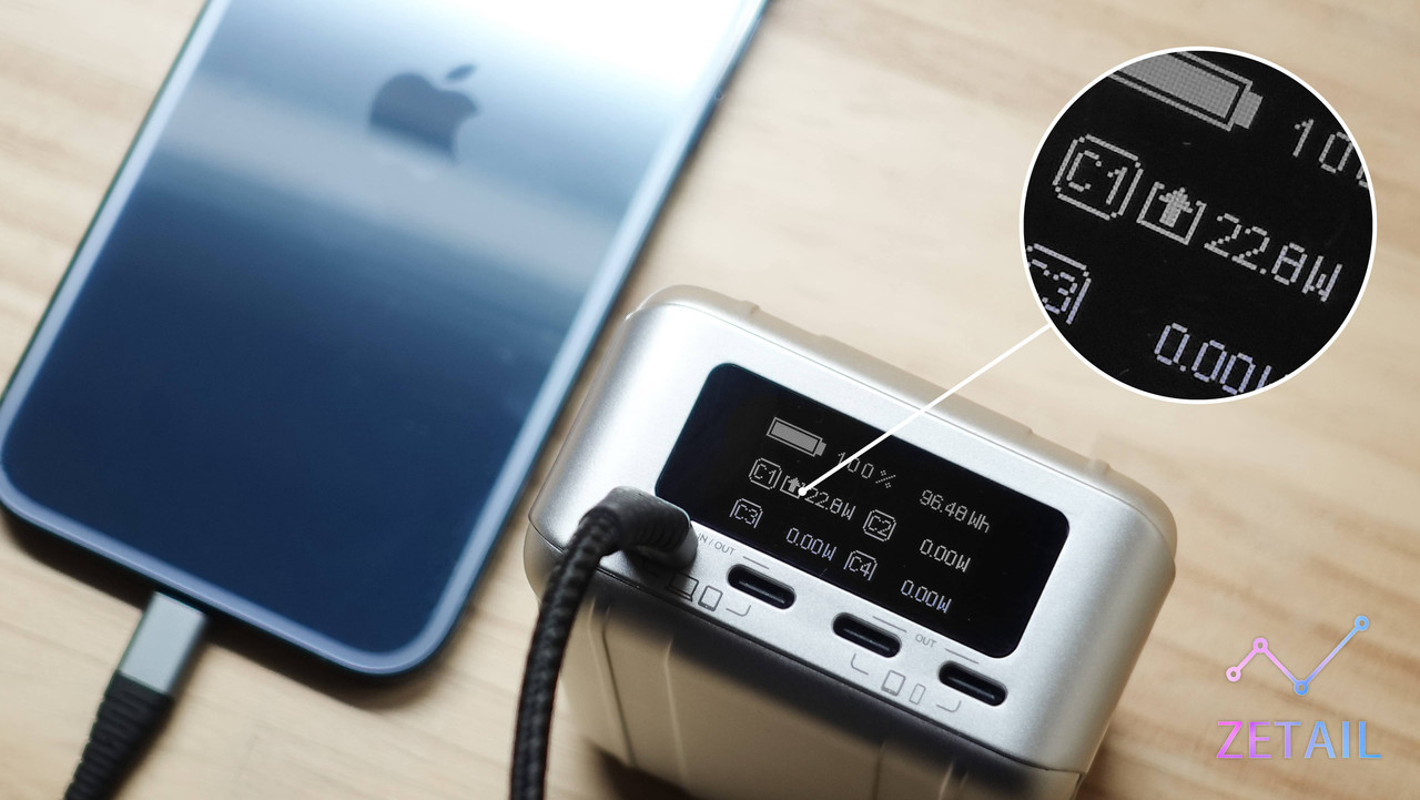 充電輸出的規格也是 SuperPort S4 的一大強項,Zendure 為它配上三個 USB-C 和一個 USB-A,共四個充電插槽,外出旅行、工作應該都十分夠用,也比較能兼顧「未來取向」和「實際層面」。SuperPort S4 單個插槽和所有插槽的最大輸出功率都是 100W,同時替手機、平板電腦、筆電、Switch…等多台裝置快速充電不是問題,而且 100W 輸出的 USB-C 插槽有兩個,讓使用彈性和便利性都大大增加。