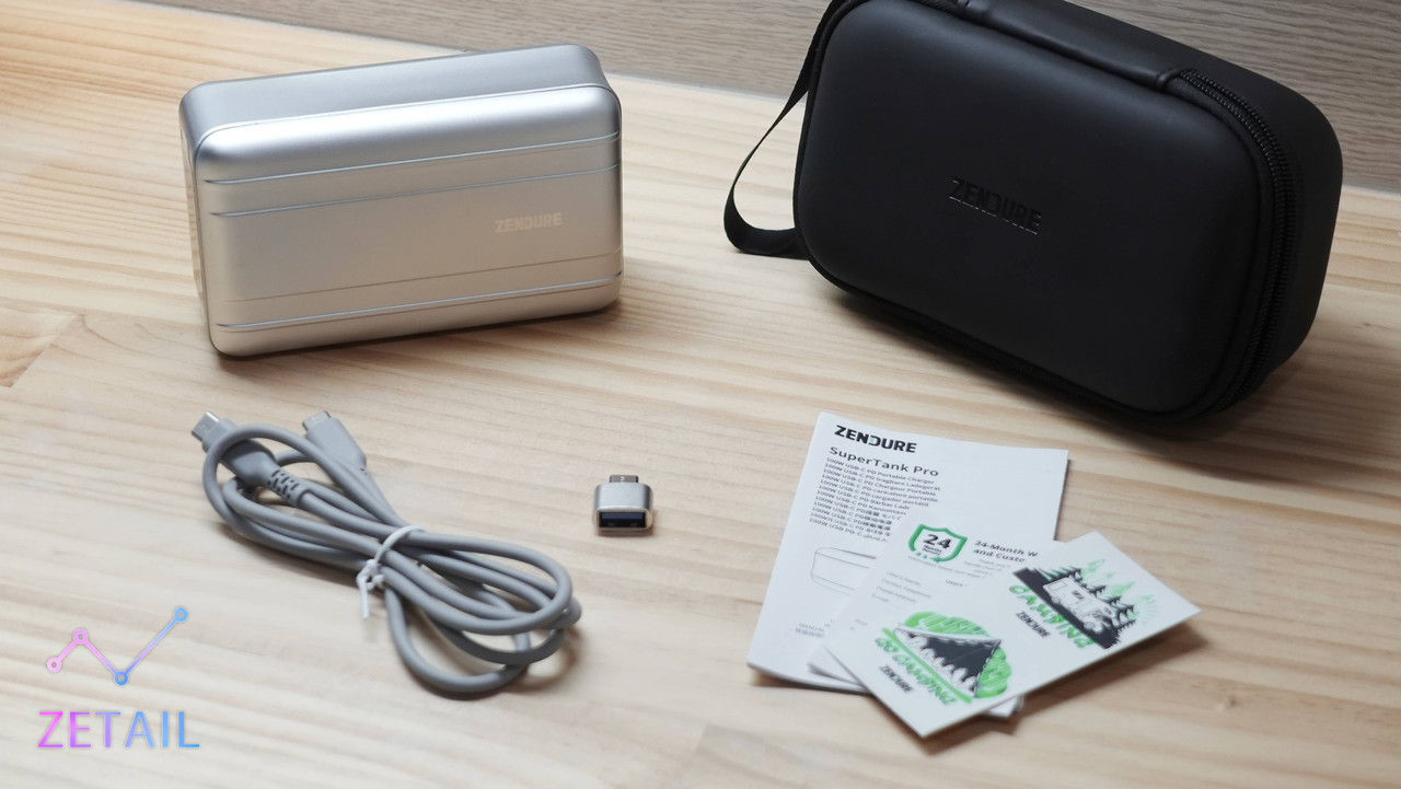 ▲ 盒裝內的內容物如上圖,包括 SuperTank Pro、EVA 防撞收納盒、一個 USB-A 轉接頭、一條 USB-C to USB-C 充電傳輸線、使用說明書、保證卡、Zendure 貼紙…等。
