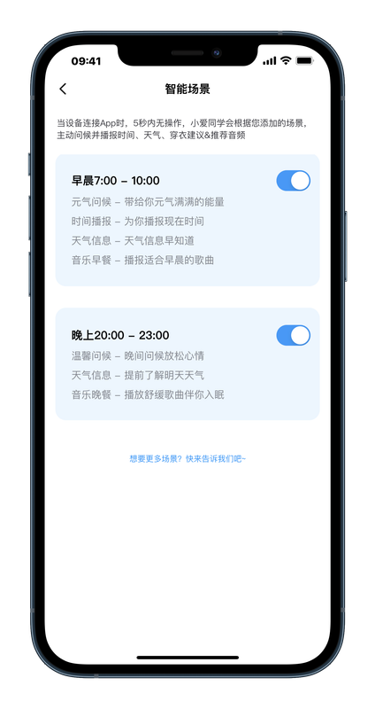 ▲ 還有「智能場景」,如果你在特定的時間段內把 PurPods Pro 連上「小愛同學」,且沒有進行任何操作,它就會播報天氣、時間、穿衣建議…等資訊。