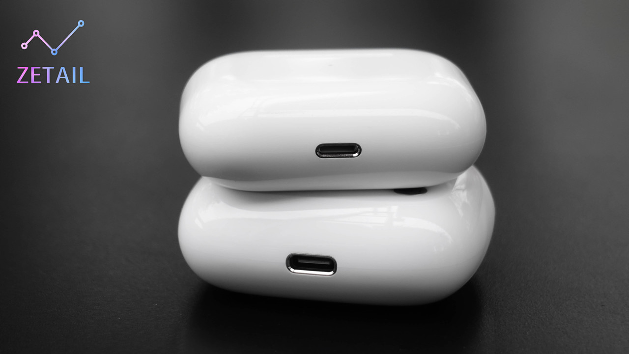 ▲ PurPods Pro(下)的充電盒底部有 USB-C 充電插槽;值得一提的是,插槽邊緣也有跟 AirPods Pro(上)一樣的切邊裝飾,精緻感提升不少。