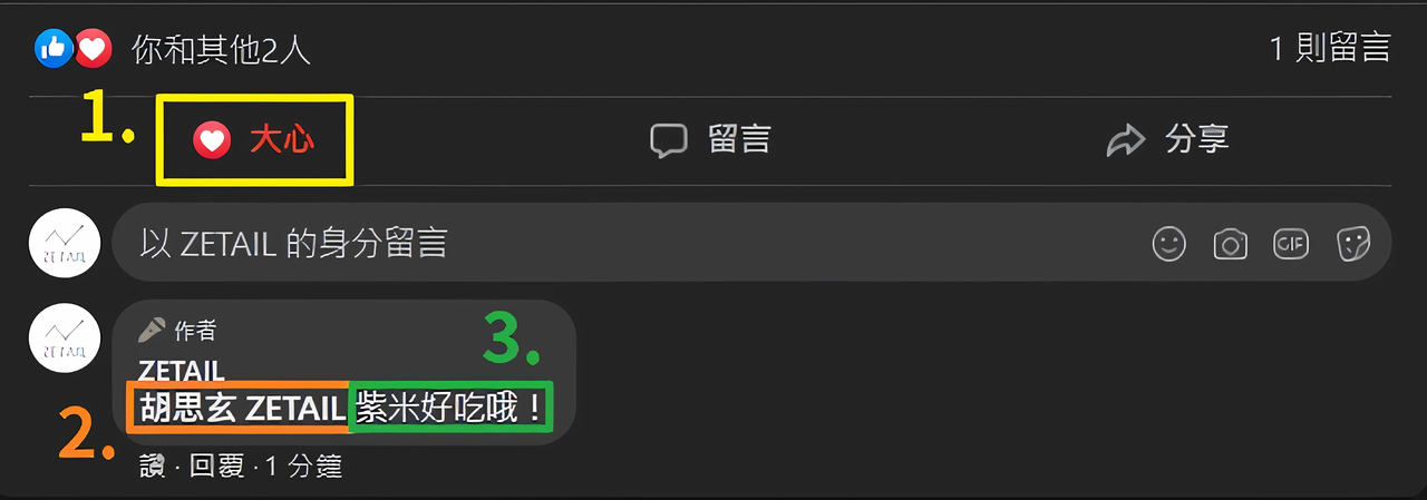 ▲ 在 ZETAIL 的 Facebook 粉絲專頁,對本篇貼文按下任一心情(1.)、標註兩位朋友(2.),並留言「紫米好吃哦」(3.)即可取得抽獎資格!