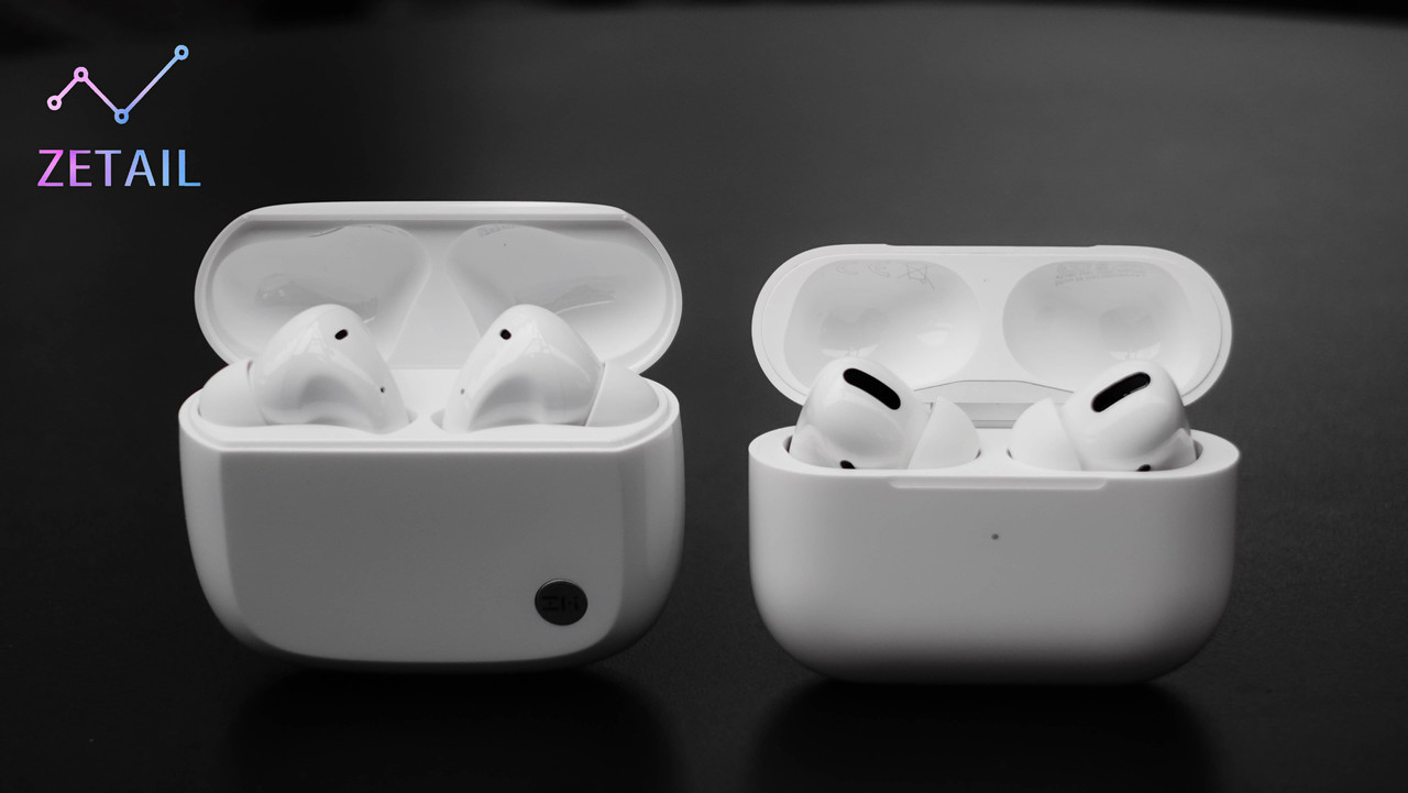 ▲ 實際和 AirPods Pro(右)對比,PurPods Pro(左)的充電盒稍微大了一圈,不過兩者的設計相當像。